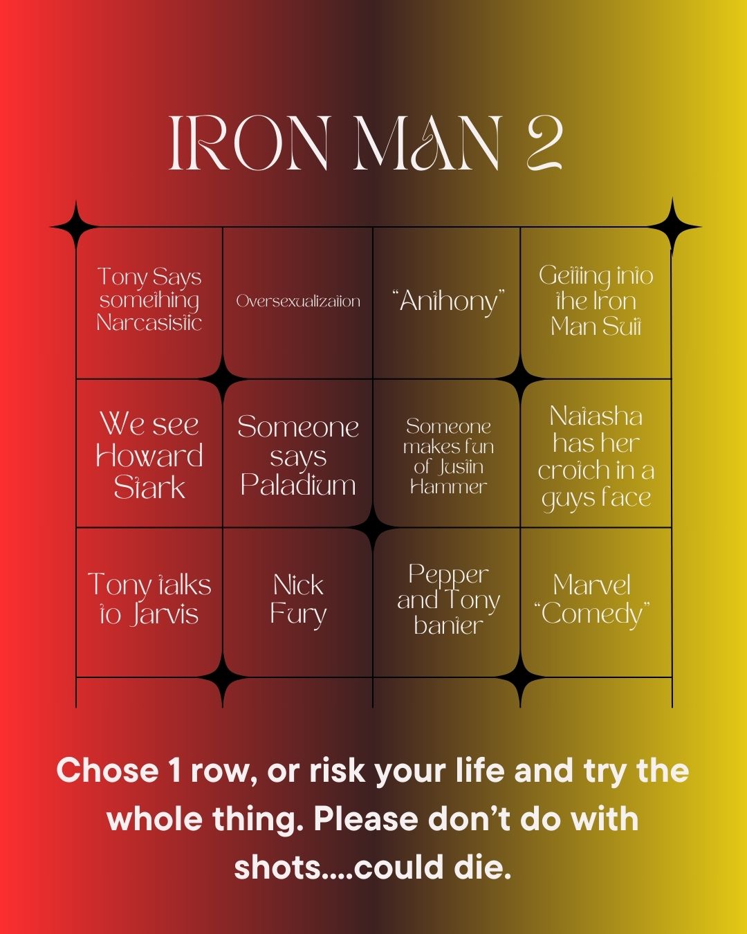 We are 5 weeks into Shang-Chi: Legend of the Ten Rings for our podcast An Idea of All Time and we are week 2 into its companion, our MCU rewatch. This week we are watching Iron Man 2 and oh boy did we fall far from the enjoyment that was Iron Man. We did in fact craft a movie specific drinking game but for full transparency you could probably reuse the game made for the first movie and still get pretty tipsy.